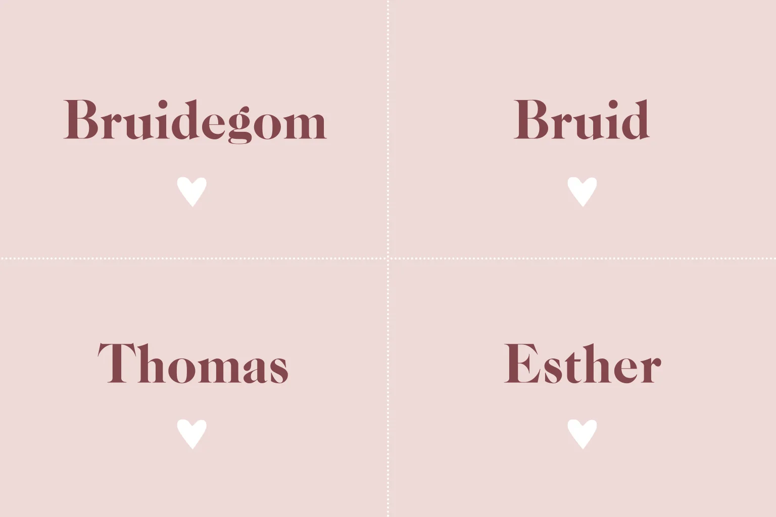 DIY kaart met 4 stuks naamkaartjes. Pas de kleuren van de naamkaartjes helemaal aan naar wens in de stijl van jullie eigen trouwkaart, zodat alles perfect bij elkaar past! Deze labels moet je nog wel zelf snijden/knippen.