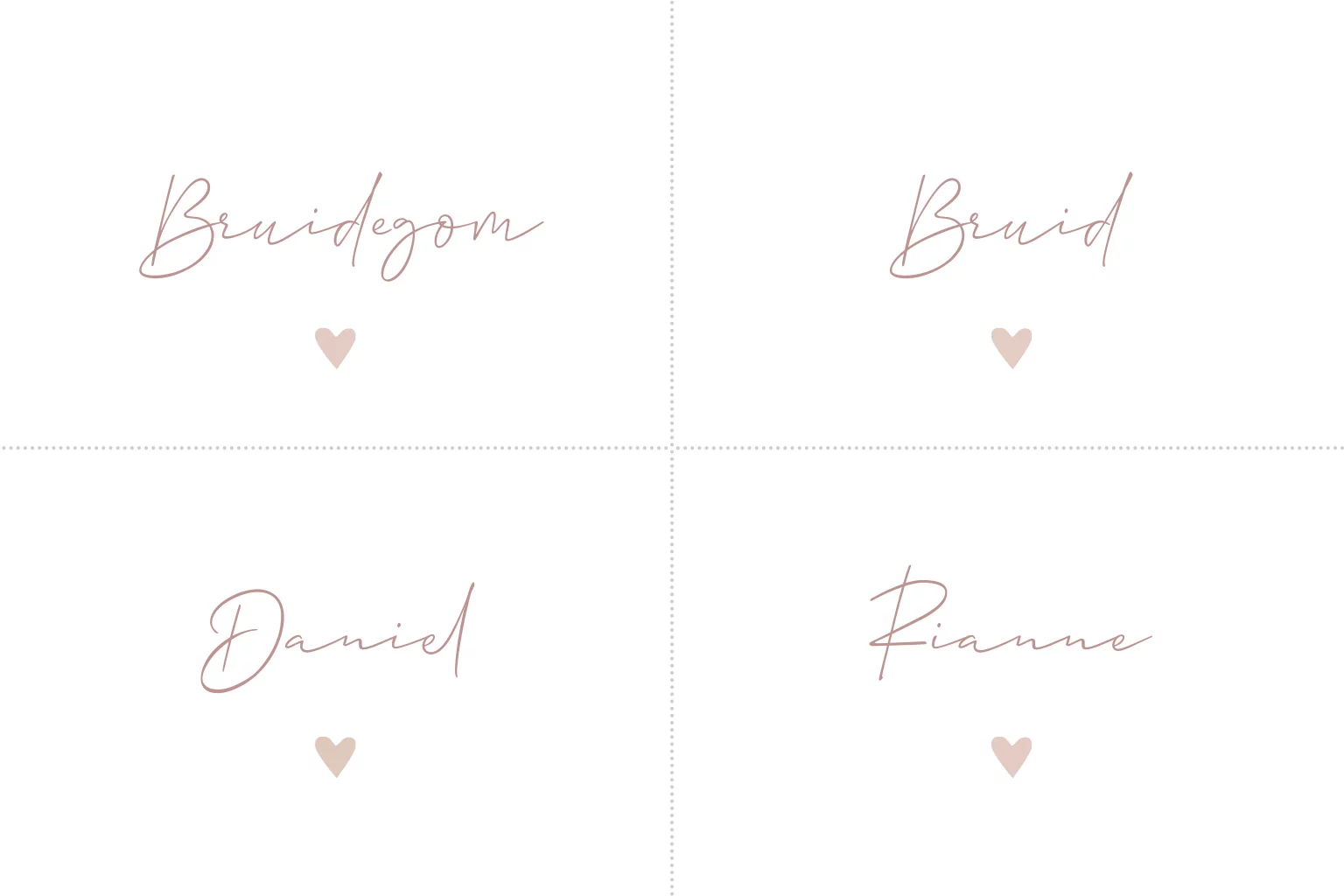 Witte naamkaartjes met oudroze tekst en hartjes. Pas de kleur van de 4 kaartjes aan in de editor, zodat het past bij jullie stijl. Knip/snijd nog de kaartjes.