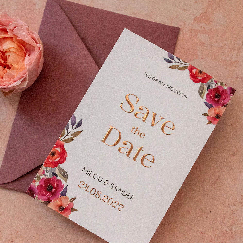 Romantische save the date kaart met rode en roze watercolor bloemen. De kaart is afgewerkt met glimmende rosefolie. Perfect voor bij een romantische bruiloft!