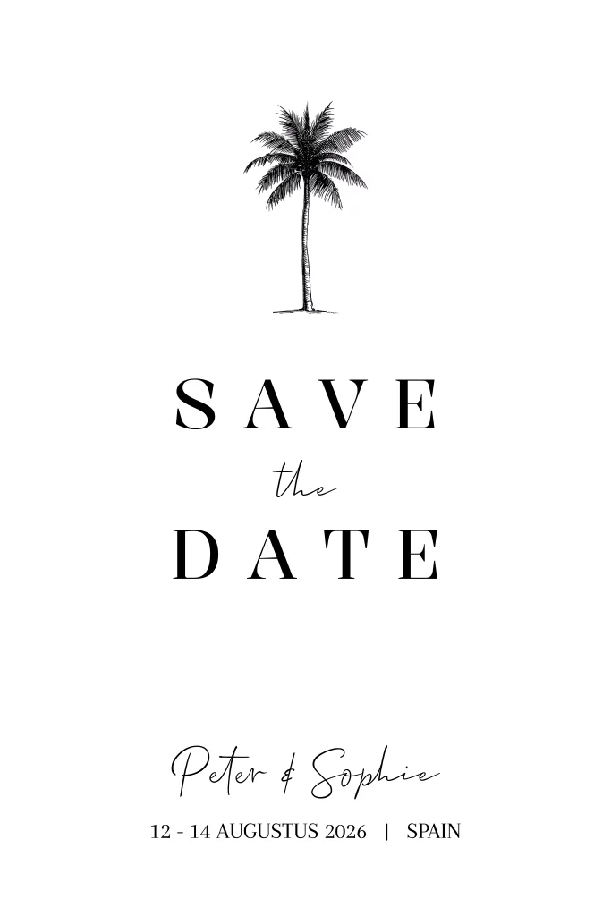 Buitenland bruiloft? Dan wil je graag dat al jullie gasten jullie trouwdatum al ver van tevoren in hun agenda zetten! Nodig de gasten voor jullie destination wedding uit met een mooie save the date kaart die past bij de sfeer van het land! Pas de kaart nog naar wens aan.