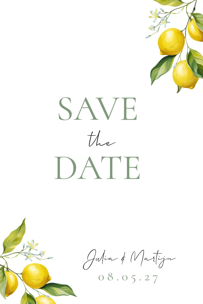 Gaan jullie trouwen in Italië? Of kiezen jullie voor een bruiloft met een Italiaans tintje? Dan past deze save the date kaart met handgeschilderde citroenen er perfect bij! Er is een bijpassende trouwhuisstijl beschikbaar, zodat alles voor jullie Italiaanse bruiloft perfect bij elkaar past!