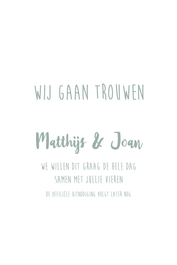 Save the Date kaart met stipjes in goudfolie en een blauw groene kleur. Met een Save the Date kunnen jullie alle gasten alvast op de hoogte stellen van jullie datum. Extra leuk om de Save the Date kaart in dezelfde stijl als de trouwkaart te maken!