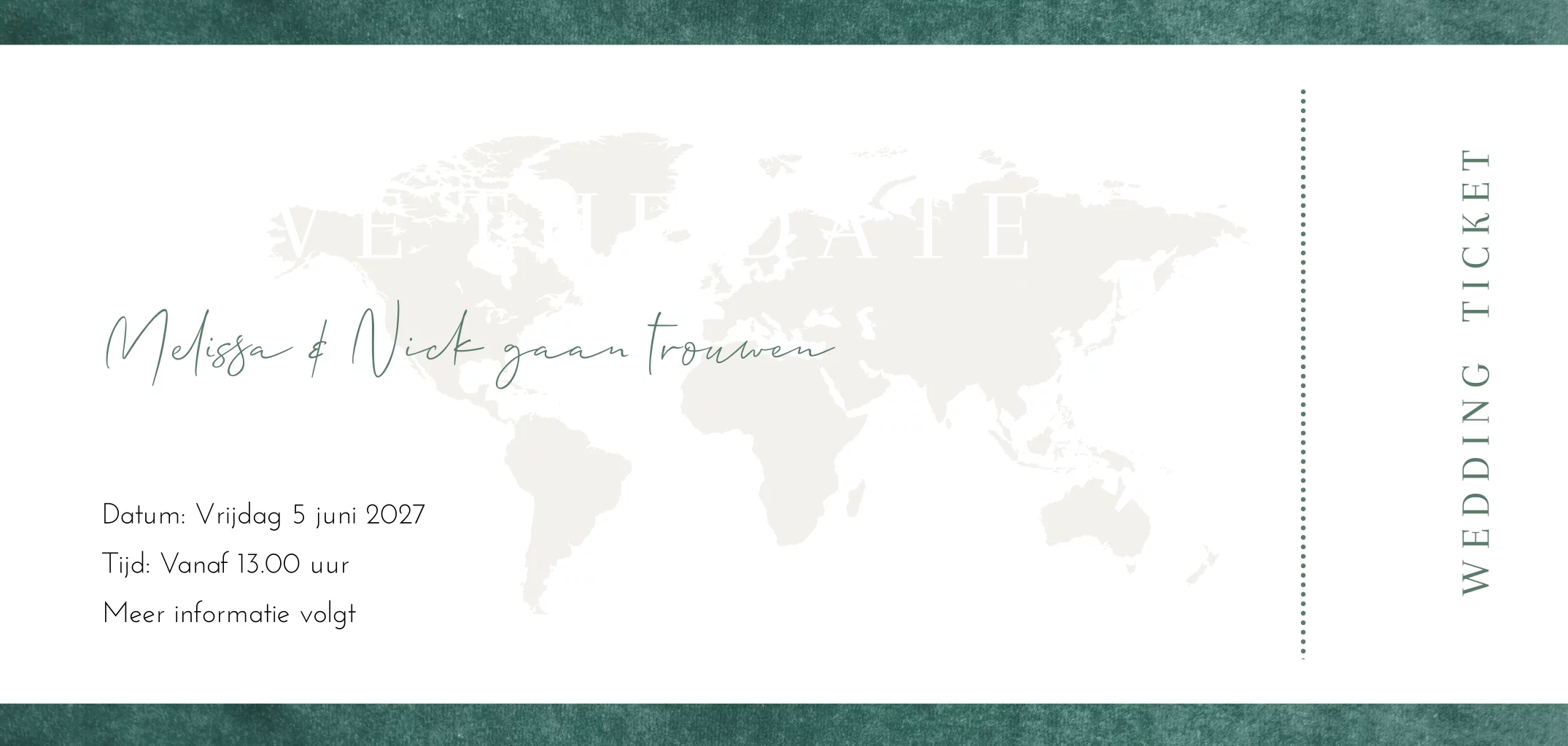 Save the date kaart in de vorm van een boarding pass. Houden jullie van reizen? Nodig jullie gasten dan uit met deze save the date in de vorm van een wedding ticket! De kaart heeft groene velvet look en goudfolie elementen.
