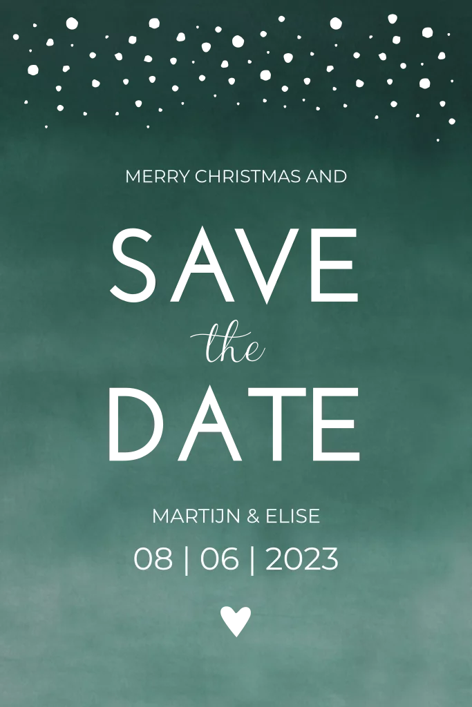 Met kerst een Save the Date kaart sturen als kerstkaart? Met deze kaart kunnen jullie alle gasten alvast op de hoogte stellen van jullie trouwdatum en een kerstboodschap sturen. De kaart heeft een donkergroene watercolor achtergrond en is afgewerkt met goudfolie. Pas de kleur van de kaart en de folie naar wens aan.