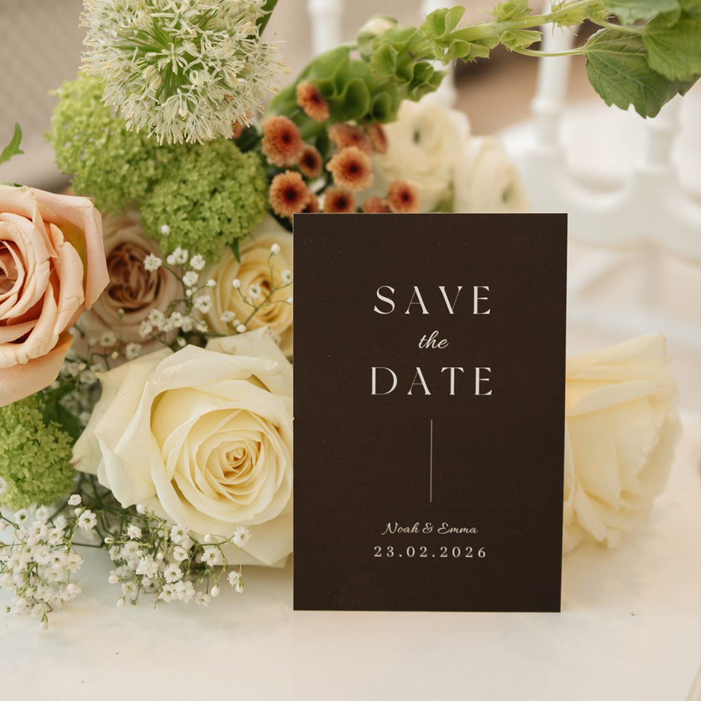 Een klassieke save the date kaart met chocolade bruine achtergrond en witte letters. Pas de kleuren en teksten nog naar wens aan, zodat het past bij de stijl van jullie bruiloft.
