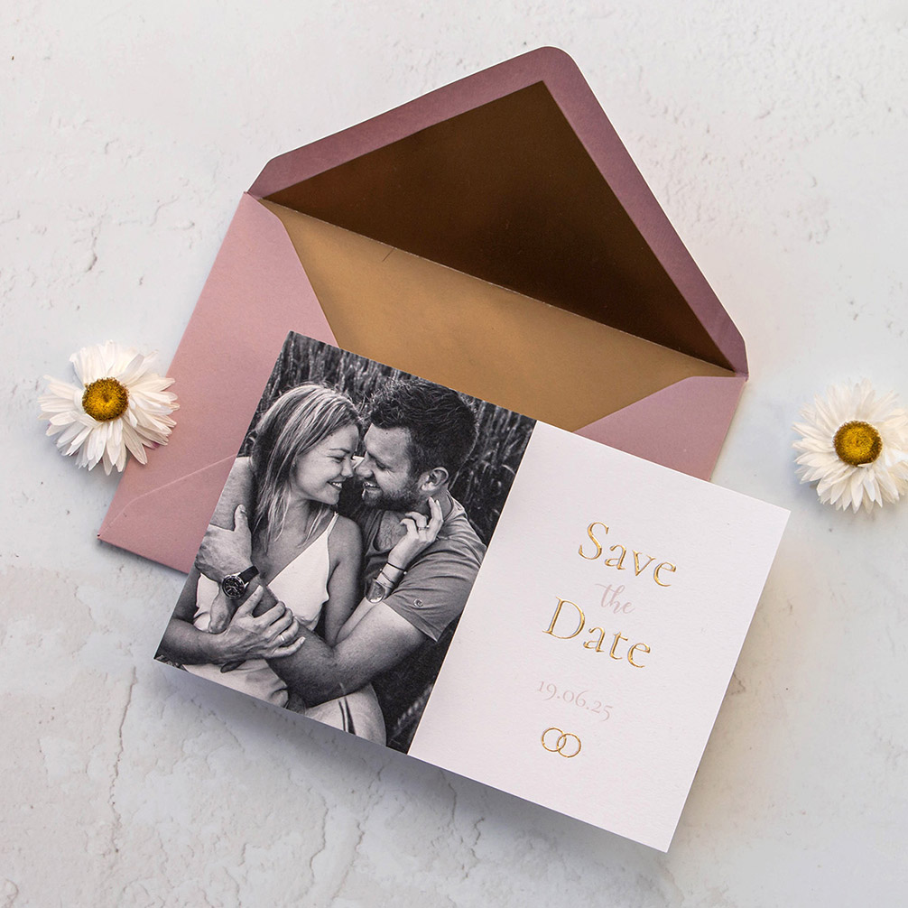 Klassieke save the date kaart met goudfolie en een foto. Vervang de foto op de kaart gemakkelijk door een foto van jullie samen! Op de achterzijde is nog plek voor extra informatie.