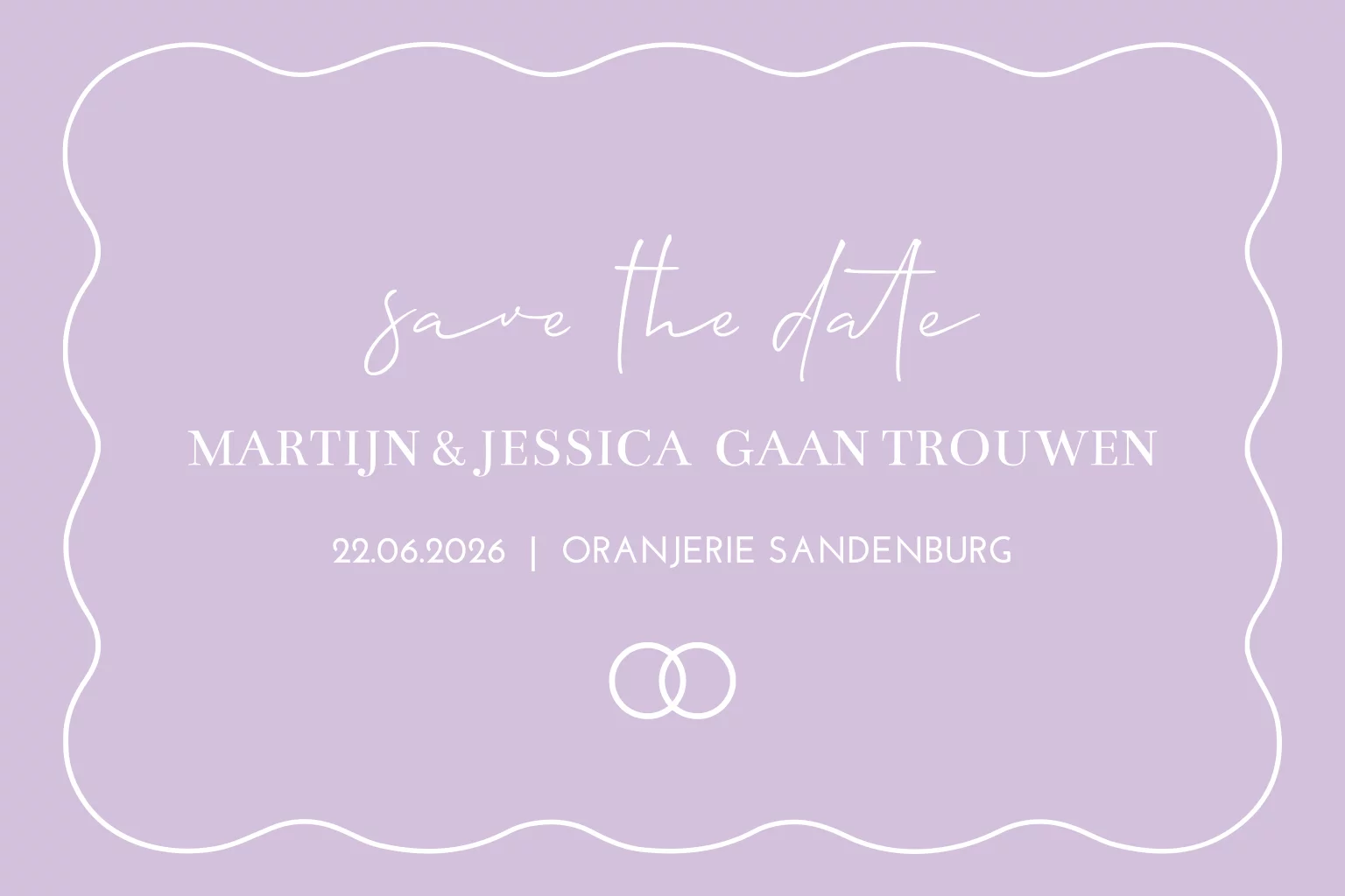 Moderne save the date kaart met lijn in golfvorm in de trendkleur lila. Pas de kaart nog naar wens aan in de stijl van jullie bruiloft.
