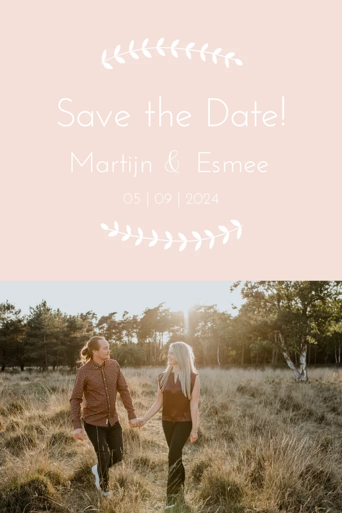 Zachtroze Save the Date kaart met foto en goudfolie letters. De foto's van een loveshoot bij jullie fotograaf kunnen jullie super mooi gebruiken op de kaarten! Zo maak je de kaart meteen persoonlijk. Extra leuk om de Save the Date kaart in dezelfde stijl als de trouwkaart te maken!