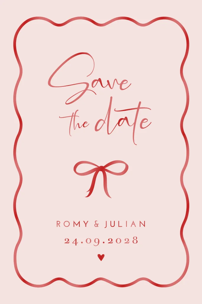 Moderne save the date kaart met golvende lijn en getekende strik. De kaart heeft een lichtroze kleur en is afgewerkt met rode hoogglans lak. Pas de kleuren van de save the date nog naar wens aan, zodat deze past bij jullie bruiloft!