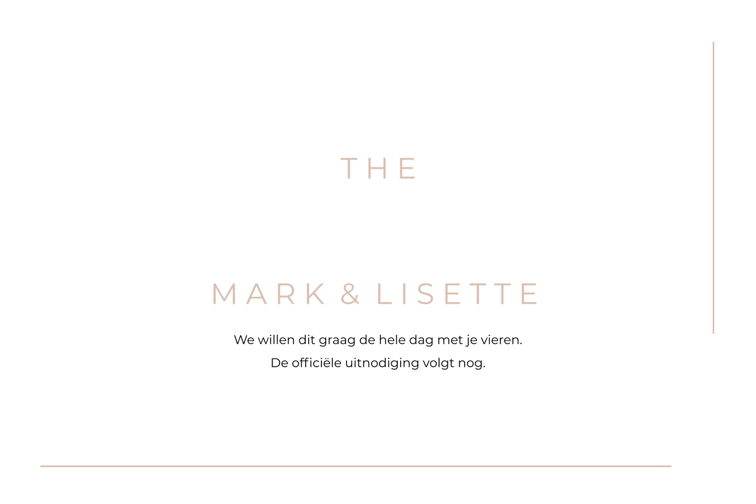Moderne save the date kaart met goudfolie en roze elementen. Deze save the date past bij een trouwhuisstijl uit de collectie. Zo is al het drukwerk voor jullie bruiloft helemaal in een stijl!