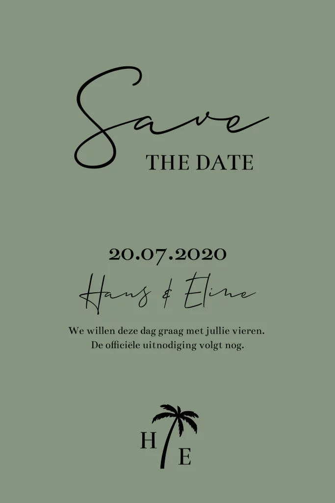 Een moderne save the date kaart voor jullie bruiloft met een olijfgroene achtergrond en zwarte letters. De kaart heeft een trouwlogo met een palmboom en initialen. Pas de kaart nog naar wens aan in de editor, zodat deze helemaal bij jullie trouwkaart past.