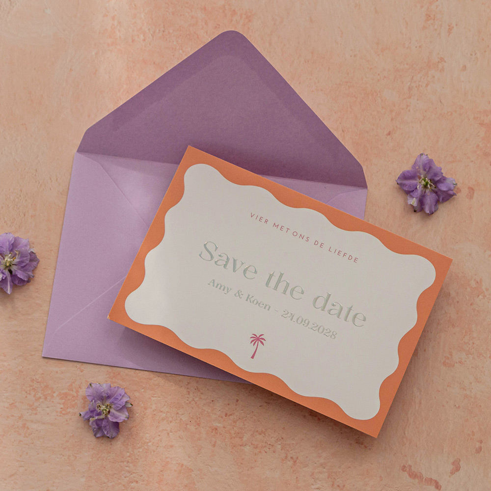 Moderne save the date kaart in oranje kleur met golvende vormen. De kaart is afgewerkt met holografische foliedruk. Met een save the date laat je jullie trouwdatum alvast weten aan de gasten. Pas de kaart nog naar wens aan in de stijl van jullie bruiloft.