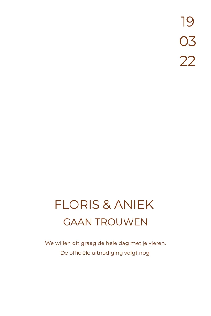 Save the Date kaart met roestbruine letters en goudfolie. Met een Save the Date kunnen jullie alle gasten alvast op de hoogte stellen van jullie datum. Extra leuk om de Save the Date kaart in dezelfde stijl als de trouwkaart te maken!