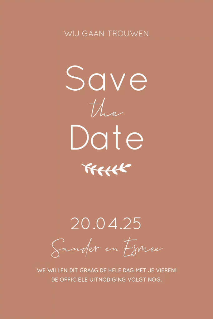 Een romantische save the date kaart met goudfolie letters en een roest kleurige achtergrondkleur. Met een Save the Date kunnen jullie alle gasten alvast op de hoogte stellen van jullie datum. Extra leuk om de Save the Date kaart in dezelfde stijl als de trouwkaart te maken!