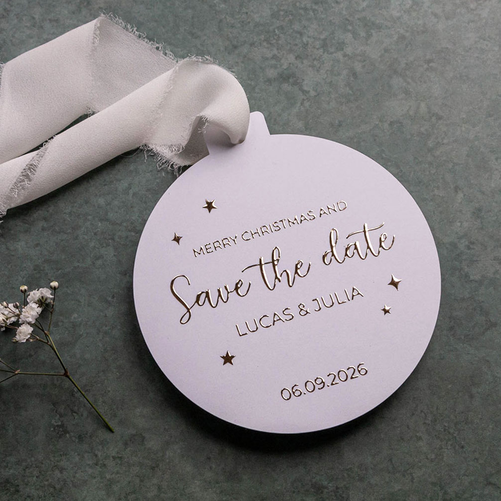 Verstuur jullie save the date kaart in de vorm van een kerstbal! Zo kunnen jullie een kerstkaart sturen en tegelijk iedereen laten weten dat jullie gaan trouwen! De kaart heeft een witte achtergrond met letters en sterren in goudfolie. TIP: voeg een mooi lintje of touw toe, zodat de gasten de kaart in de kerstboom kunnen hangen!