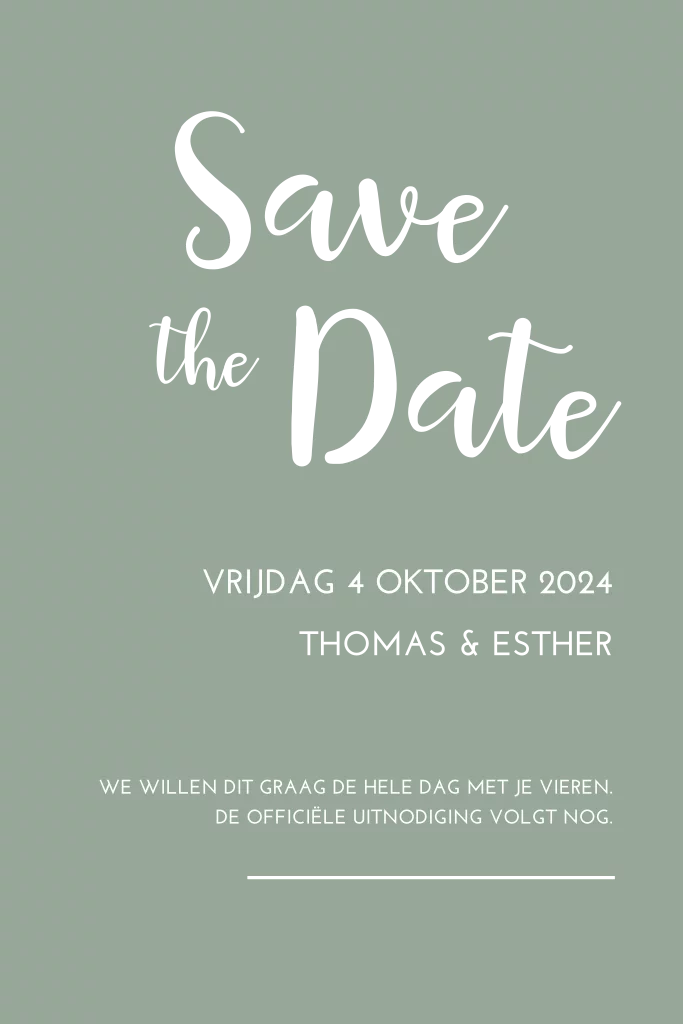 Olijfgroene Save the Date kaart met sierlijke goudfolie letters. Met een Save the Date kunnen jullie alle gasten alvast op de hoogte stellen van jullie datum. Extra leuk om de Save the Date kaart in dezelfde stijl als de trouwkaart te maken!