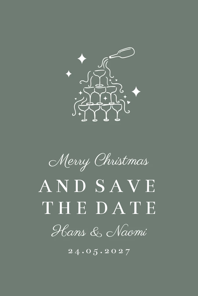 Een kerstkaart save the date met groene achtergrond, goudfolie en champagne toren. Zo verstuur je een kerstkaart en save the date in één! Met deze kaart brengen jullie alle gasten alvast op de hoogte van jullie trouwdatum. Op de achterzijde is plaats voor een mooie kerst boodschap.