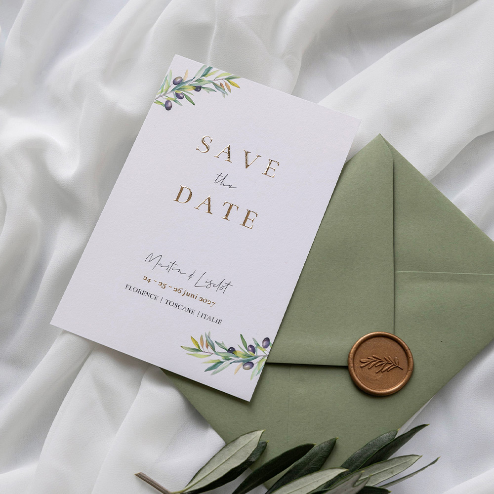 Geven jullie elkaar het jawoord in het mooie Italië? Laat de datum van jullie destination wedding weekend weten aan alle gasten met een save the date kaart. Op deze kaart met goudfolie staan watercolor olijftakjes die perfect passen bij een bruiloft in Italië.