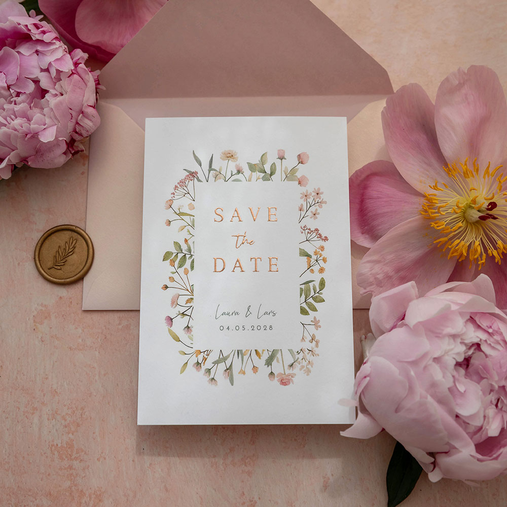 Romantische save the date kaart met een rand van pastel bloemen. De kaart is afgewerkt met rosefolie en er is een bijpassende trouwkaart beschikbaar in dezelfde stijl, zodat alles voor jullie bruiloft mooi bij elkaar past!