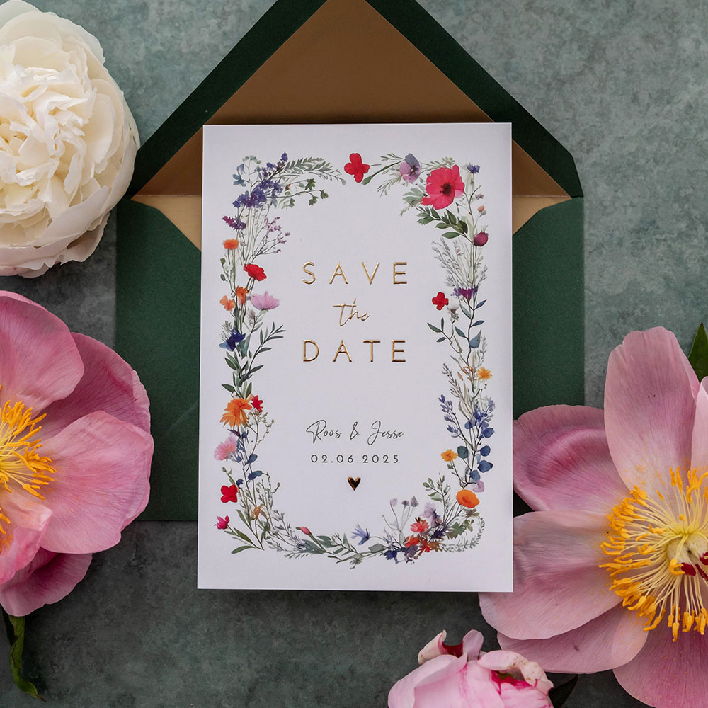 Romantische save the date kaart met een rand van gekleurde wilde veldbloemen in watercolour stijl. Deze kaart met bloemen is afgewerkt met goudfolie. Pas het ontwerp nog naar wens aan in de editor.