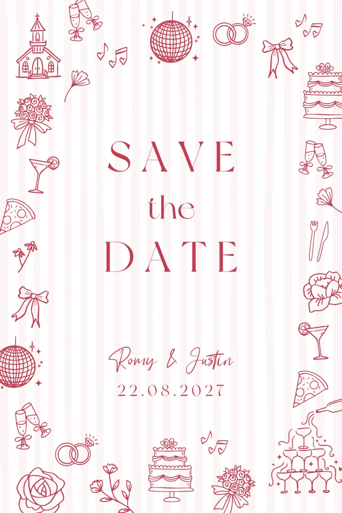 Moderne save the date kaart met rode tekeningen en lichtroze strepen. Verstuur een save the date kaart naar de gasten van jullie bruiloft om hen alvast de trouwdatum te laten weten.