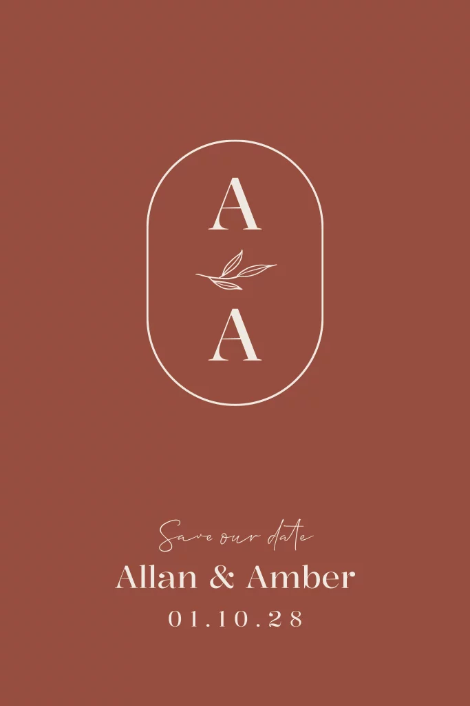 Save the date kaart met een trouwlogo met initialen en een takje. De kaart heeft een roest rode kleur en past perfect bij een herfst bruiloft! Pas de kleuren van de save the date nog naar wens aan, in het kleurenpalet van jullie bruiloft.| Totaalprijs: 0 |