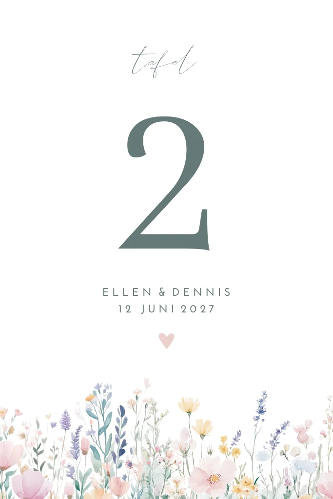 Ontwerp mooie tafelnummer kaarten voor op de dinertafel van jullie bruiloft. Pas het ontwerp naar wens aan en vul de cijfers in. Maak een kopie van het ontwerp als je meerdere tafelnummer kaarten nodig hebt. Thema: Blooming Love