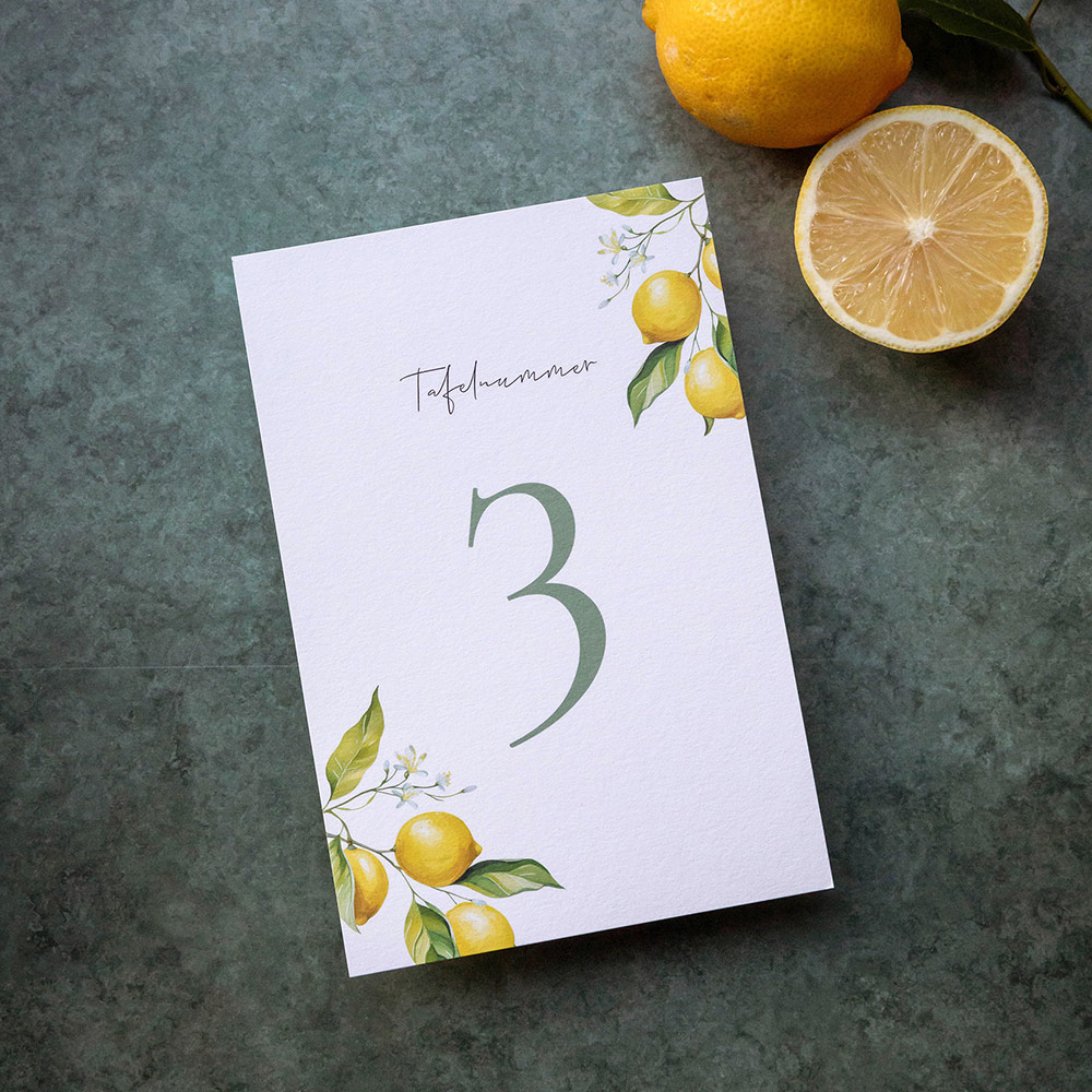 Ontwerp mooie tafelnummer kaarten voor op de dinertafel van jullie bruiloft. Pas het ontwerp naar wens aan en vul de cijfers in. Maak een kopie van het ontwerp als je meerdere tafelnummer kaarten nodig hebt. Thema: Lemon Love