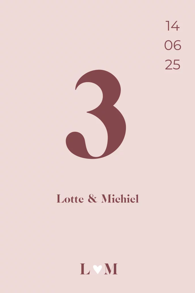 Ontwerp mooie tafelnummer kaarten voor op de dinertafel van jullie bruiloft. Pas het ontwerp naar wens aan en vul de cijfers in. Maak een kopie van het ontwerp als je meerdere tafelnummer kaarten nodig hebt. Thema: Modern Love
