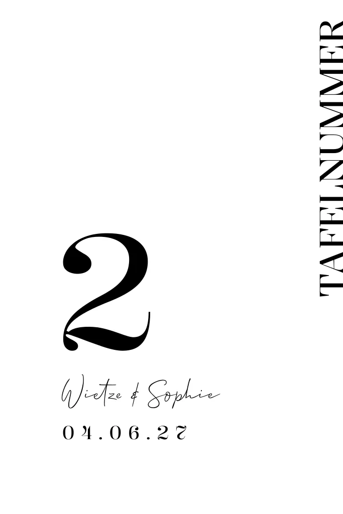Ontwerp mooie tafelnummer kaarten voor op de dinertafel van jullie bruiloft. Pas het ontwerp naar wens aan en vul de cijfers in. Maak een kopie van het ontwerp als je meerdere tafelnummer kaarten nodig hebt. Thema: Black & White