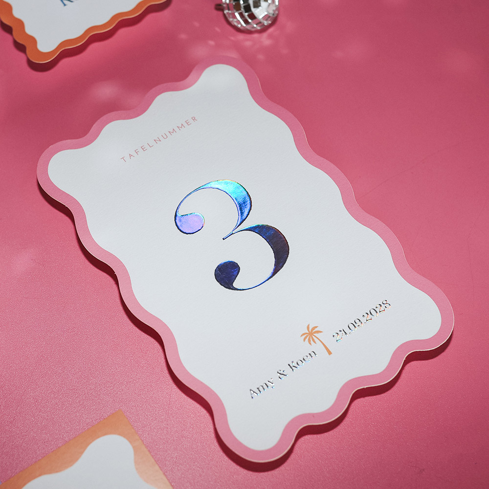 Ontwerp mooie tafelnummer kaarten voor op de dinertafel van jullie bruiloft. Pas het ontwerp naar wens aan en vul de cijfers in. Maak een kopie van het ontwerp als je meerdere tafelnummer kaarten nodig hebt. Thema: Wavy Love. Fotografie: Janneke Tol Photography