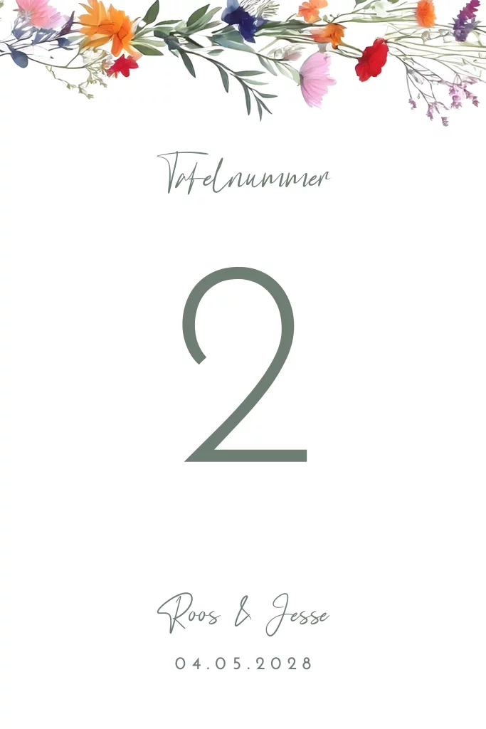 Ontwerp mooie tafelnummer kaarten voor op de dinertafel van jullie bruiloft. Pas het ontwerp naar wens aan en vul de cijfers in. Maak een kopie van het ontwerp als je meerdere tafelnummer kaarten nodig hebt. Thema: Wildflower love.