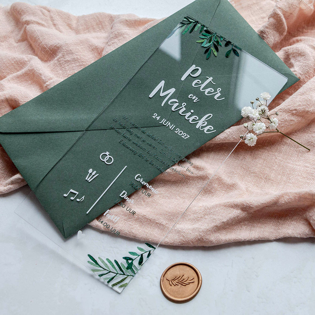 Deze doorzichtige trouwkaart op acryl is een luxe uitnodiging voor jullie bruiloft. De kaart is gedrukt op plexiglas en heeft witte letters en groene blaadjes. Pas de acryl trouwkaart nog naar wens aan.