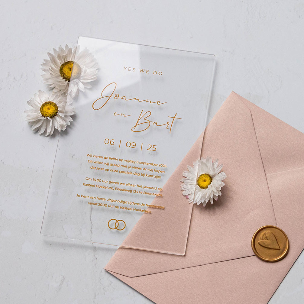 Op zoek naar een luxe en moderne trouwkaart voor jullie bruiloft? Deze acryl trouwkaart (ook wel plexiglas genoemd) is echt een cadeautje om te versturen aan jullie gasten! Pas de kleuren en lettertypes nog helemaal naar wens aan.