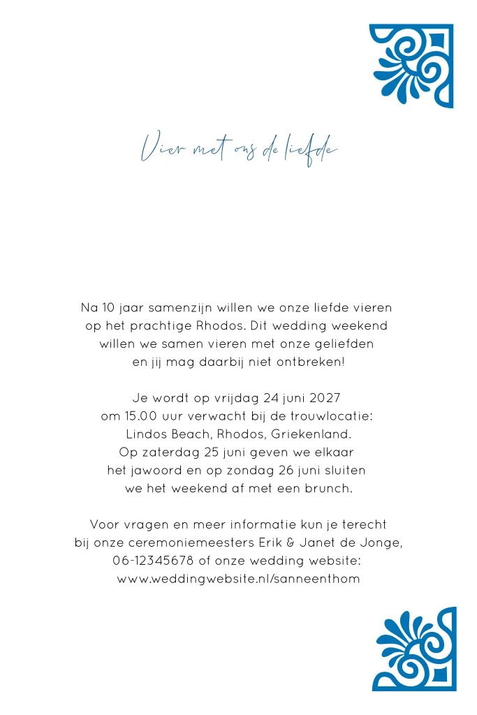 Trouwen jullie in Griekenland? Met deze trouwkaart in Griekse stijl kunnen jullie alle gasten uitnodigen voor jullie wedding weekend. De uitnodiging is afgewerkt met goudfolie en heeft blauwe mediterrane elementen. Pas de kaart nog naar wens aan in de editor.