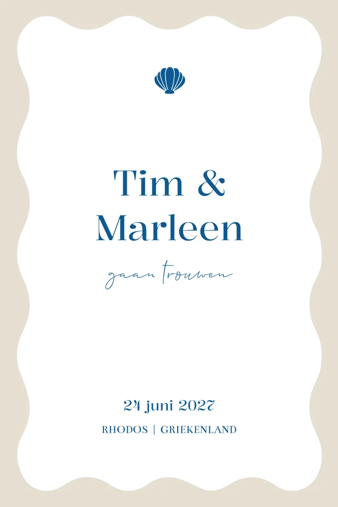 Moderne trouwkaart speciaal voor de feestgasten. Nog helemaal naar wens aan te passen. Thema: Beach vibes.Heb je een vraag of hulp nodig? Mijn team en ik helpen je graag! We zijn bereikbaar op werkdagen van 9.00 tot 18.00 uur.