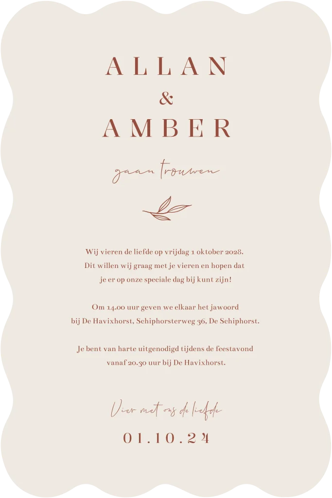 Moderne trouwkaart met een unieke golvende vorm. Deze trouwkaart is speciaal voor de feestgasten en past bij de trouwhuisstijl Autumn chique. Pas de trouwkaart zelf nog naar wens aan in de editor.