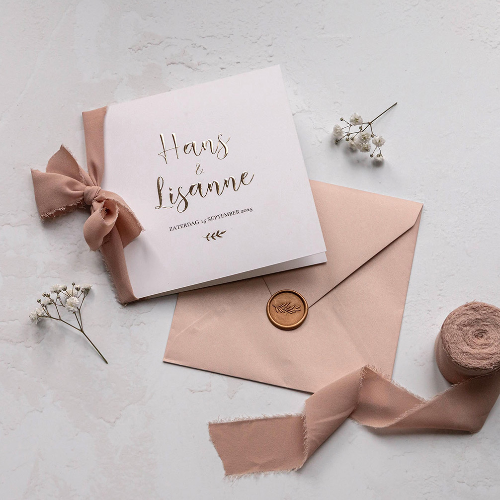 Trouwkaart met sierlijke goudfolie letters en strik