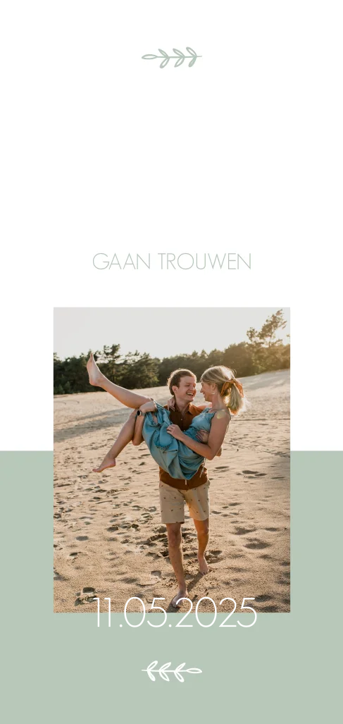 Trouwkaart groen met takjes, foto loveshoot en rosefolie