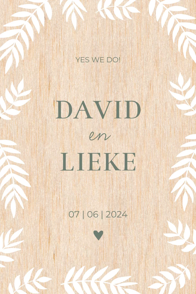 Op zoek naar een unieke trouwkaart? Deze kaart met ronde hoeken is gedrukt op echt berkenhout van 1 mm dik! De kaart heeft een rand met botanische bladeren en je kunt de kleur van de kaart naar wens aanpassen.