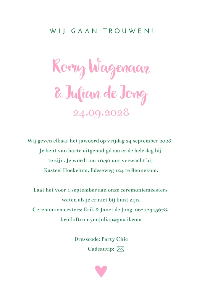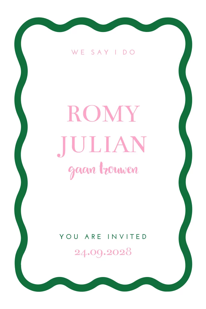 Maak jullie grote dag onvergetelijk met deze kleurrijke en moderne trouwkaart! Deze uitnodiging heeft een golvende lijn en groene en roze kleuren. Perfect voor een kleurrijke bruiloft! Pas de kleuren van de trouwkaart nog naar wens aan.