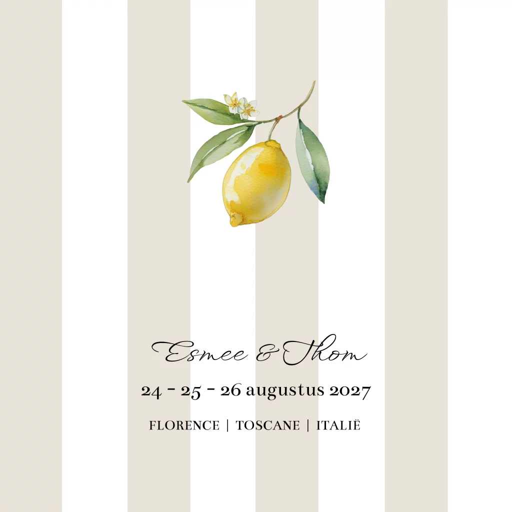 Mediteraanse trouwkaart met strepen en citroen, passend bij een Italiaanse bruiloft. Aan de binnenzijde is plaats voor een mooie tekst over jullie wedding weekend in Italië. Pas de kleur van de kaart naar wens aan.