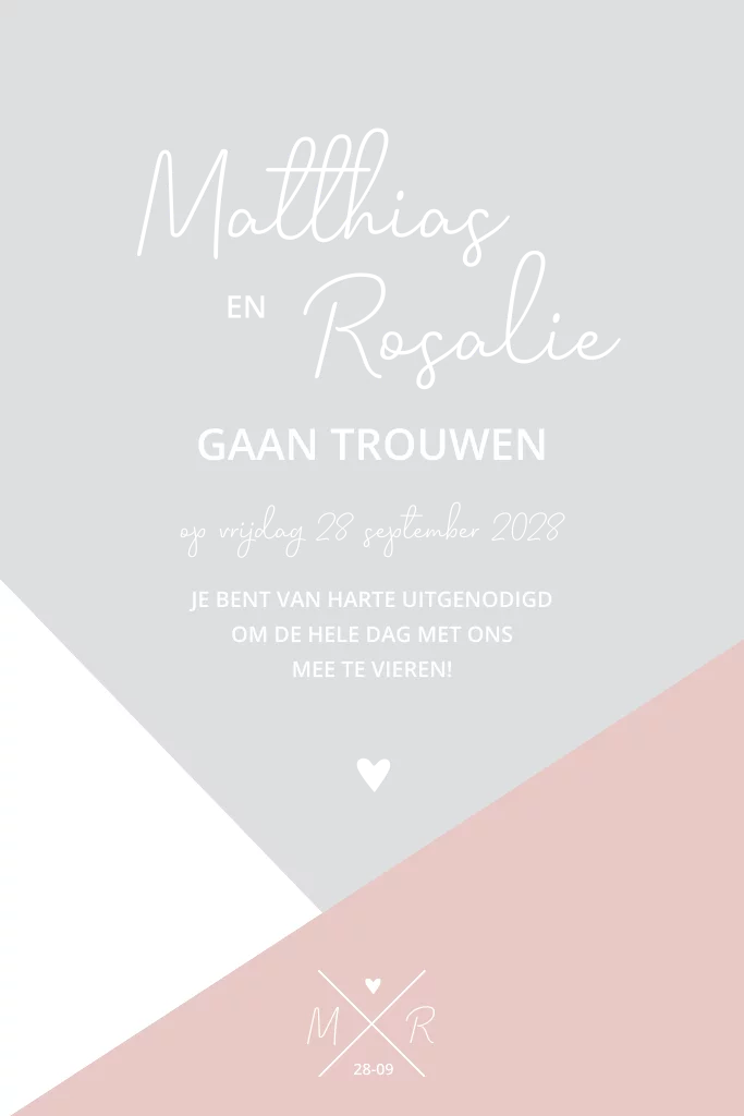 Moderne trouwkaart met geometrische vormen in de kleuren grijs, wit en roze met rosefolie. Pas de kleur van de kaart en de folie naar wens aan. Op de achterzijde van de kaart is plaats voor extra informatie.