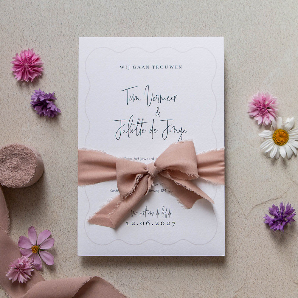 Moderne trouwkaart met lijn in golf vorm en zwarte sierlijke letters. Bij deze kaart Bij deze kaart past een mooi chiffon lint, die je om de kaart heen kunt strikken. Pas de kleuren van de uitnodiging nog naar wens aan.