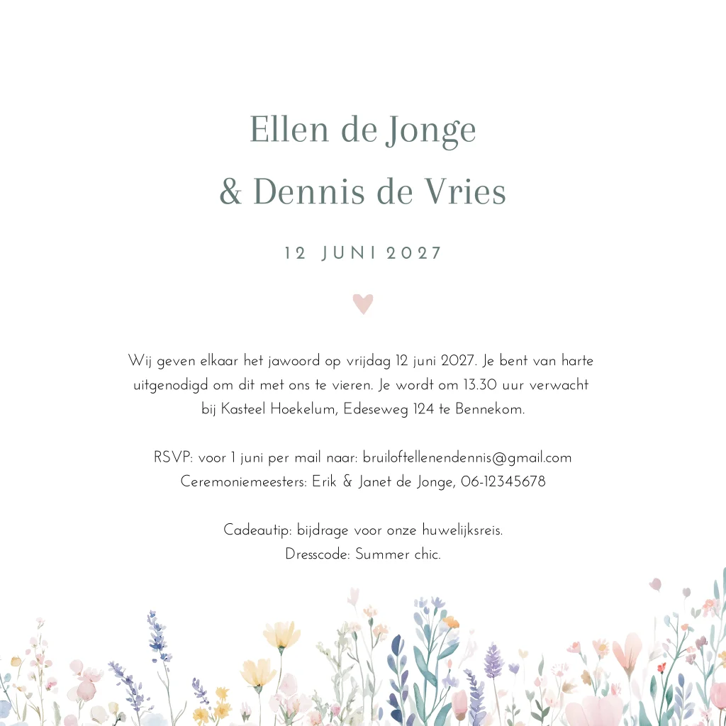 Romantische trouwkaart met bloemen in een dubbelgevouwen formaat. Aan de binnenzijde is plaats voor alle informatie en een mooie tekst of een gedichtje. De trouwkaart heeft een rand van pastel gekleurde veldbloemen. Pas de trouwkaart nog naar wens aan in de editor.