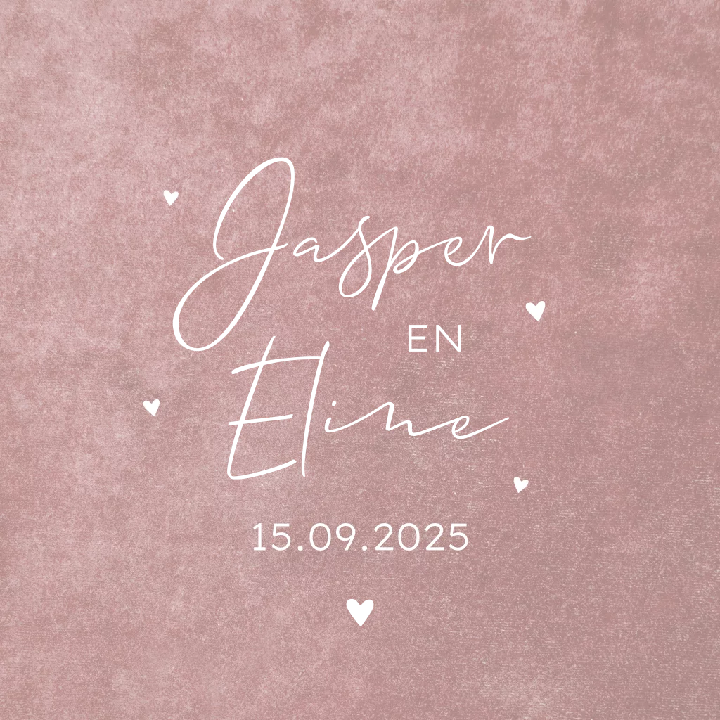 Dubbel gevouwen trouwkaart met oud roze velvet look achtergrond, sierlijke goudfolie letters en hartjes. Pas de kleur van de kaart en de folie naar wens aan. Aan de binnenzijde staat een tijdlijn met icoontjes voor het programma van de dag.