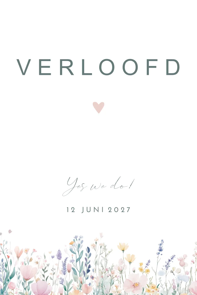 Verlovingskaart met gekleurde bloemen en sierlijk lettertype. Op de achterzijde is plaats voor een verlovingsfeest uitnodiging. Passend bij de trouwhuisstijl Blooming Love.