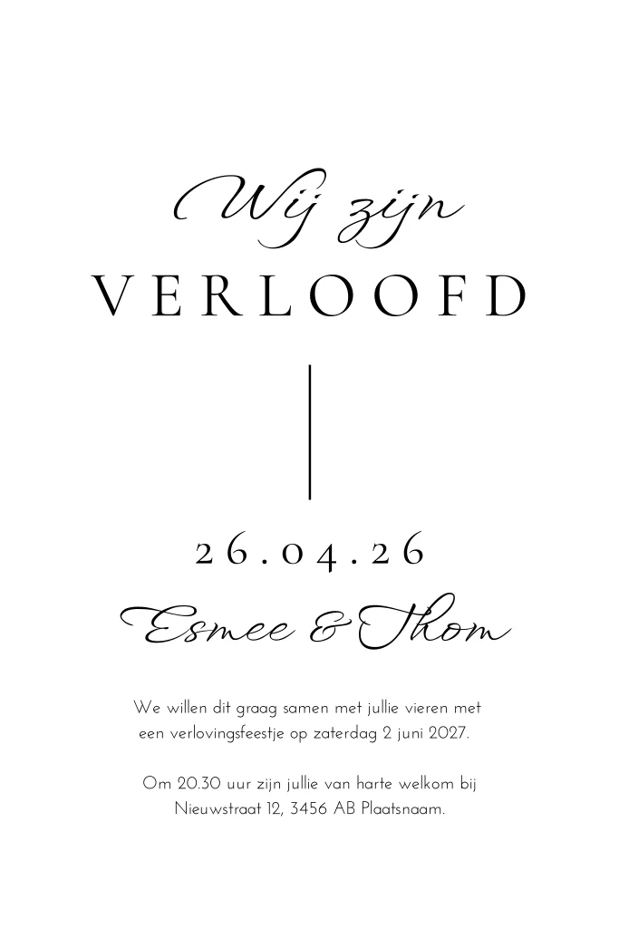 Klassieke verlovingskaart met zwarte letters en uitnodiging voor een verlovingsfeest. Deze uitnodiging is onderdeel van een trouwhuisstijl: zo past alles voor jullie bruiloft mooi bij elkaar! Tip: dit ontwerp komt mooi uit op een luxe papiersoort met structuur zoals Oud Hollands of linnen.| Totaalprijs: 0 |