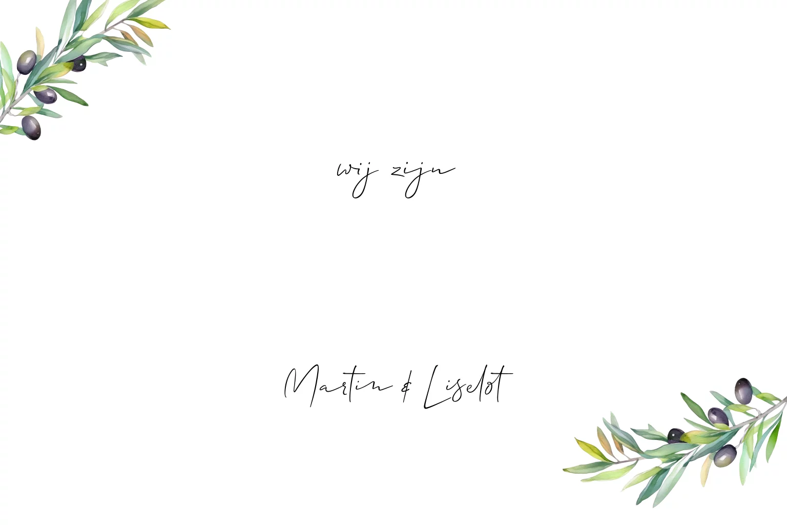 Romantische verlovingskaart met olijftakjes en goudfolie letters. Er is een bijpassende trouwhuisstijl beschikbaar bij deze kaart. Thema: Olive & Green| Totaalprijs: 0 |
