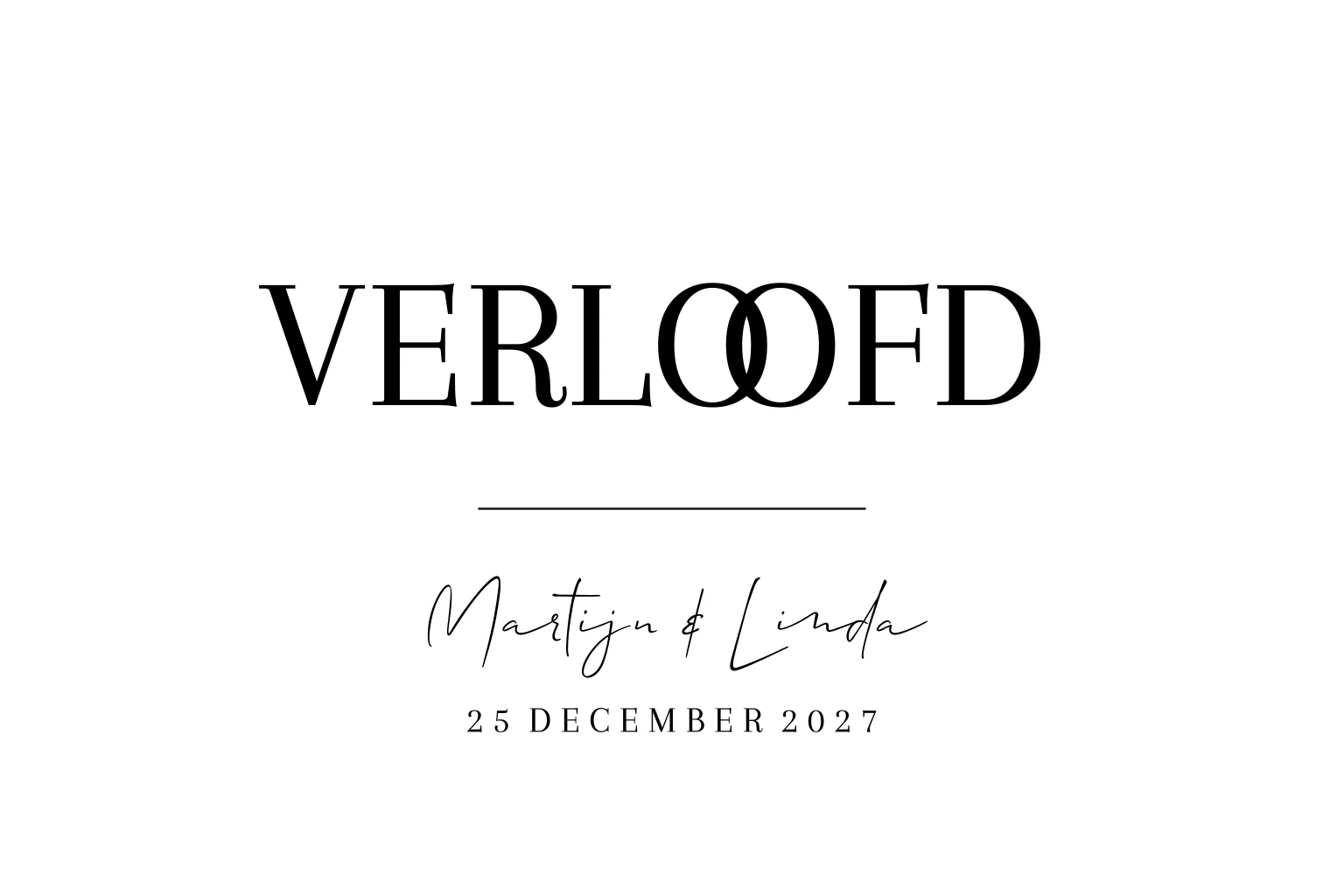 Klassieke verlovingskaart met zwarte letters en een witte achtergrond. Aan de achterzijde is plaats voor een verlovingsfeest uitnodiging. Je kunt de kleuren van de kaart nog naar wens aanpassen.
